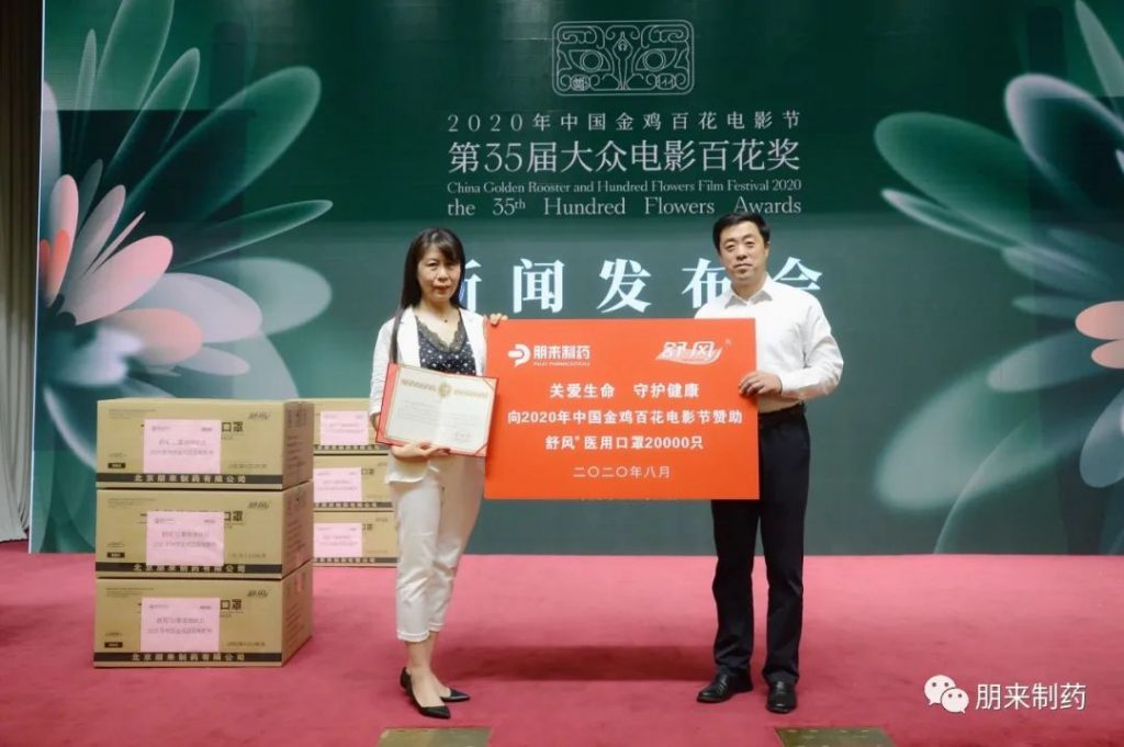 8月29日下午,在“2020年中国金鸡百花电影节暨第35届大众电影百花奖新闻发布会”会场,影协分党组副书记、秘书长闫少非接到北京朋来制药代表送来的20000只“舒风”医用口罩,对朋来制药心系社会的服务精神深深感动。至此,北京朋来制药有限公司与北京朗天中盛国际文化传媒有限公司(简称朗天娱乐)联合开展的“助力中国电影,守护观影健康”爱心公益活动圆满落幕。